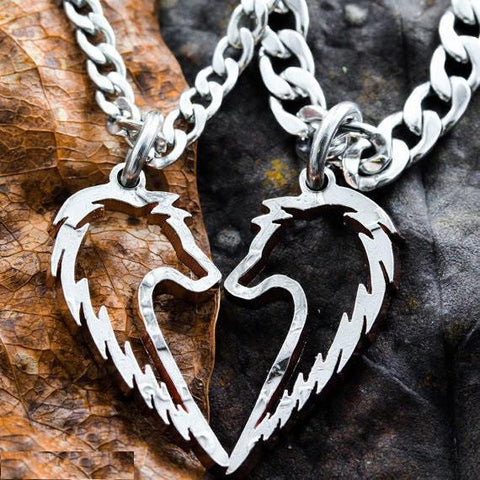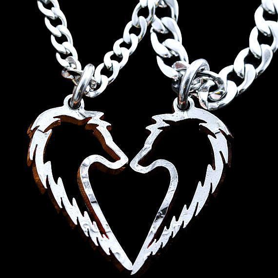 Wolves, their symbol is as powerful as it is profound, with monograms make excellent handmade jewelry gifts. Each wolf necklace fits perfectly with each other. These wolf necklaces make a heart when together and are very cool apart.